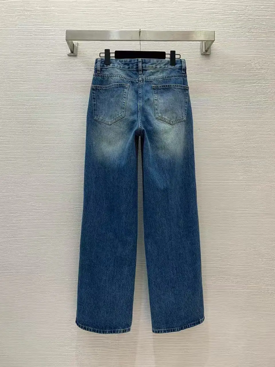 New high-end customized women's casual jeans, classic old flower leather brand high waist straight wide leg jeans